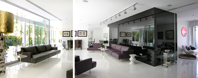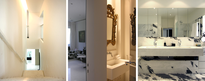 living unit for a family of five. The building is situated in a listed urban zone and changes to the form of the exterior shell were to be kept to the minimum. However, the spatial experience has been radically transformed. The natural environment is now indivisible from the built. The boundary of the house is transered from the traditional front door to the front gate. Upon entering, a peripatetic journey begins to unfold on a sequence of platforms that flow between inside and outside. Glass was used to absorb the ground floor verandas into the interior, which was cleared from the majority of walls, creating a constellation of spaces that breath between the opacity of the existing and the transparency of the new. The volume of the new staircase is the core of the spatial order. Articulated as a carved monolith and clad in sheets of black glass, it is simultaneously volume and surface, present and absent, centre and periphery, reinforcing thus the dymamic relationship between interior and exterior.